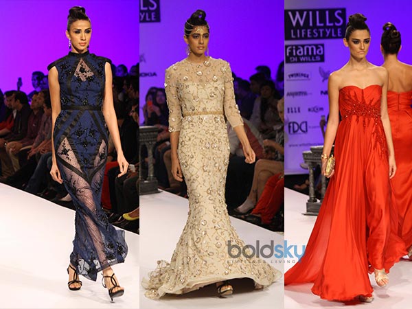 Amit GT has brought red carpet glamour on the WIFW 2014 ramp with his colourful and sequinned gowns. Amit GT's show was a heady mix of jewel tones, beige palette blended with diaphanous layers and intricate embellishment! Amit GT presented his range of gowns starting with midnight blue, and covering all tertiary colours.