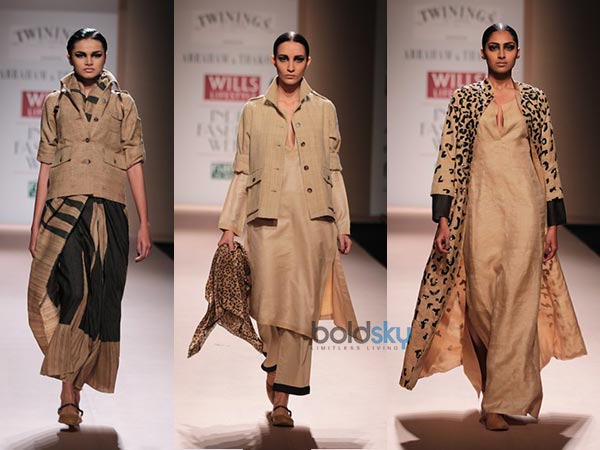 Ikat prints drowned in raw silk were seen in Abraham And Thakore's autumn winter collection at Wills India Fashion Week 2014. A collection based on the urban shikar, where the streets of a city are the terrain, a smartphone the defense. Abraham and Thakore present their complete collection in shades of beige, blak and white. Classy and elegant outfits were seen at Abraham and Thakore's autumn winter 14-15 collection at Day 3 of Wills India Fashion Week 2014.