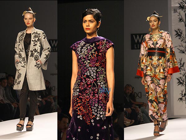The Japanese fashion was brought on the Indian ramp by Payal Pratap. The show opened with Bjork singing. Black silk kimonos with monochrome prints were seen in the beginning of the show. Metallic, velvet and monochromatic kimono inspired dresses with vibrant Japanese clogs at Payal's show. Even colourful floral print and thread embroidery were seen on the ramp. Monochrome, cherry blossoms and magnificent prints looked bright and colourful on the ramp.