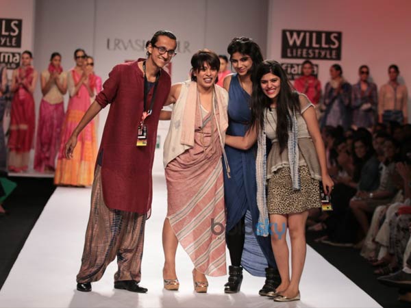 With an affinity for indigenous, hand-woven textiles, the usage of silk weaves like Maheshwaris, Chanderi, Tassar, Tissue, Matka, Kota and, Khadi cotton, resonate the free reign of thought of the human mind. sheer, translucent voiles and linens was extensively used in the Shunya autumn-winter 14-15 collection of Urvashi Kaur. Bright colours like pink, saffron, orange, red and yellow were seen on the ramp.