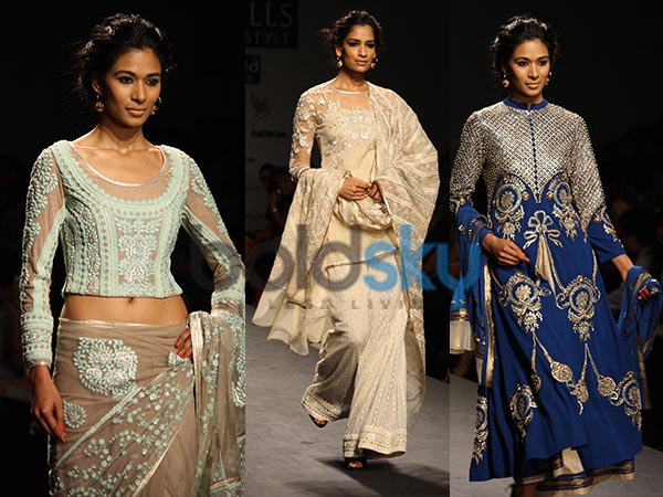 Vineet Bahl has used his trademark Banarasi fabrics along with Tussar georgettes. We have seen him use the net pattern of embroidery in almost all the creations. This style of embroidery builds a mesh like pattern that gives uniformity to the ‘Utsav' collection. Although the WIFW 2014 collection is about life and celebration, colour comes on gradually on the ramp. First, there are some white outfits, then colour seeps in slowly in the collection.