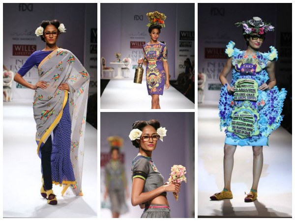 On the ramp it was a fun event. The models were being so casual in presenting her collection at WIFW 2015. Each of the outfits had heavy accessories - head gears, soft ballerina floral shoes and not to forget hand fans to beat the oncoming summer heat.