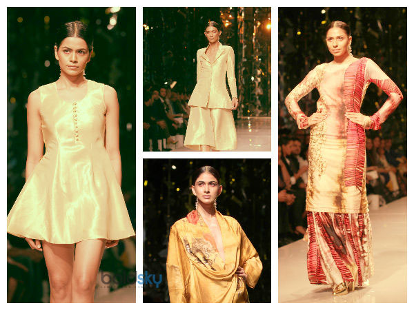 From all her designs, this is the very first of Masaba's which has embellishments. The gowns of sheer and prints had sparkling embellishments, so did the borders of some of the outfits. Here again she designs the collection solely for youth. The vibrant metallic colours which is seen on the ramp is exclusively for a generation of the 21st century.
