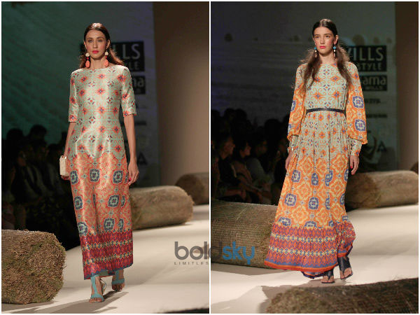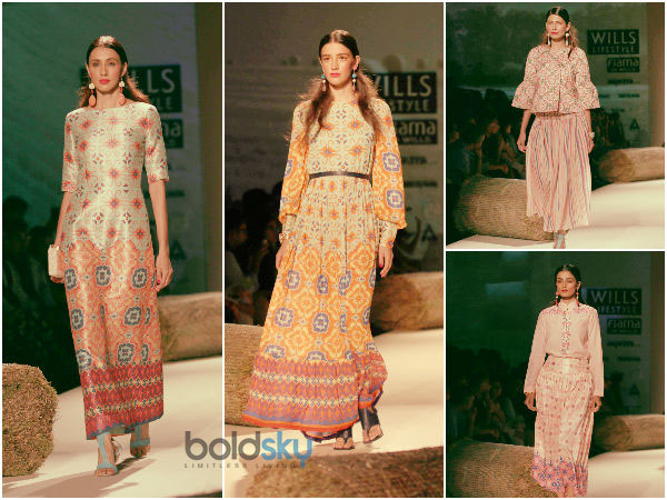 On the ramp, the first line of Ms Pratap's collection was gleaming. The fabric that was used resembled a plastic kind of material. The special glow it had on these designs were mesmerizing. At the same time we timeless elegance, rustic exuberant creations and craft based patterns.