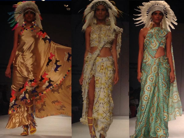 Pia Pauro introduced laser cut in sata fe patterns which were made into flowy kaftans, flared lehenga and gorgeously well fitted sarees.