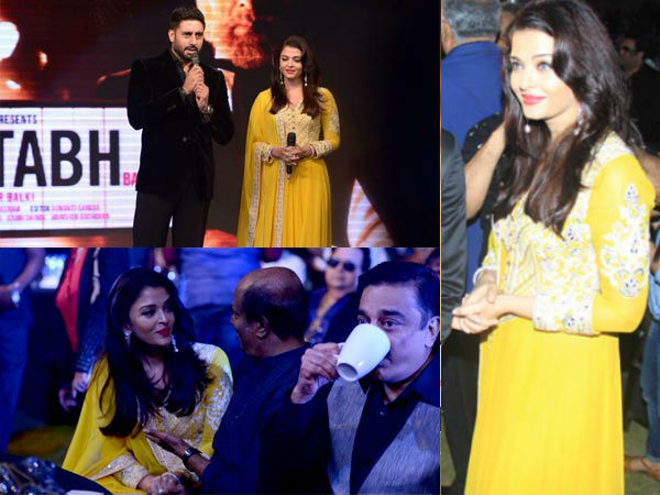 At 'Shamitabh' music launch, the gorgeous diva walked the red carpet wearing both her favourites. Ash looked bright in a yellow coloured anarkali suit with matching churidaar pants. The ankle length anarkali had intricate silver embroidery all over it.