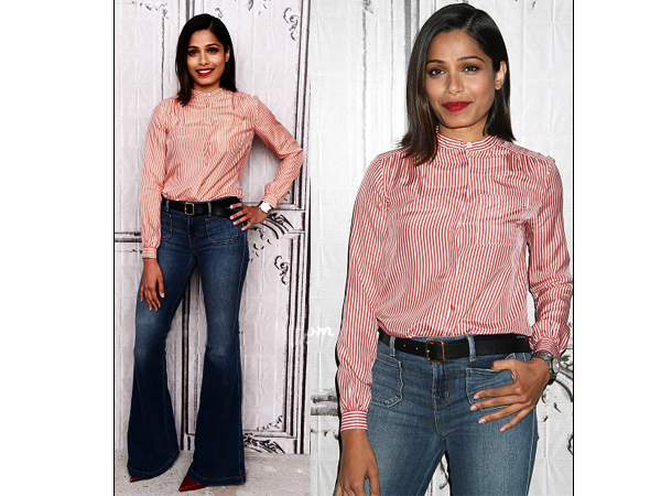 Frieda Pinto looked so smart in those retro flared denims, red and white stripe shirt and red pointy court shoes.
