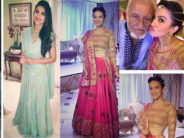 Gauahar Khan wore the pink lehenga with a heavily embellished three-quarter sleeved blouse which looked perfect! She draped the dupatta of the lehenga in the front to flaunt the heavily sequinned blouse.