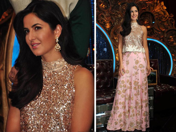 The actress donned a chic desi look for the appearance and glittered in a Manish Malhotra creation. Katrina Kaif wore a glittering sequinned top with a lehenga patterned long skirt both from Manish Malhotra for her appearance on the celebrity dance competition show.