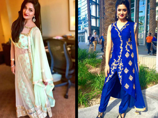 The sheer anarkali featured golden embellishments all over it and was worn with a matching churidar pants. It also had sheer detailing on the bodice and neckline. Vimala completed the look with a matching dupatta which was pinned on one side in the floating style.