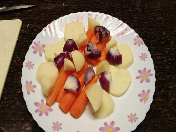 - Take the baking tray & add the carrots, onions ( or celery & leaks ) & potato. Arrange it like a bed where you can place the chicken upon. Tie the legs of the chicken together & then the wings of the chicken together.