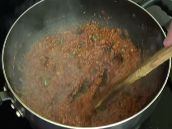 6. Now add the tomato paste and cook well till it begins to leave the sides (8-10 mins).
