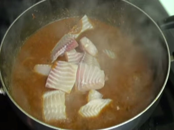9. Make sure not to add too much water as this curry tastes best when thick. Put the fish pieces slowly, taking care that they do not break. Swirl the dish once, close with a lid and keep on low flame. The fish needs to absorb the spices for about 10 mins.