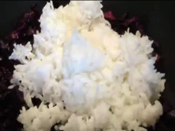 - Allow the red cabbage to cook over a low flame. When the cabbage begins to shrink, add in the cooked rice to the pan.