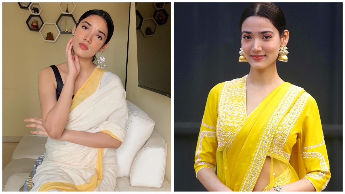 The Dil Bekarar series actor shared a fabulous look in an ivory-white plain saree with pale yellow border detailing and teamed it up with a black tank top style blouse. To accentuate the contemporary style saree ensemble, Medha opted for chandbali-style jhumka earrings. The Beecham House movie star complemented her minimalist style saree look with natural makeup, a small black bindi, and a centre-parted bun hairstyle.