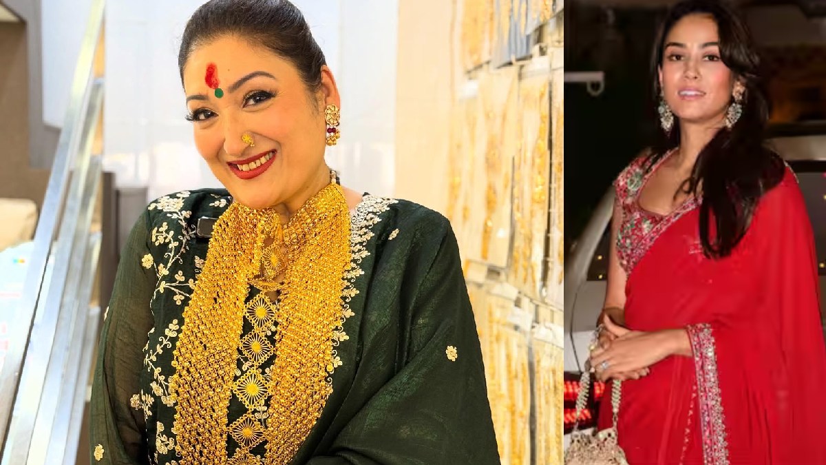 Bhavana Pandey, wife of Chunky Panday and mother of Ananya Panday looked radiant in a bright magenta traditional suit with golden embroidery. The vivid hue captured the joyful essence of the festival, and her presence holding the ritual karwa and thali reflected the sincerity that defines Karwa Chauth. Her look was full of life, warmth, and devotion.