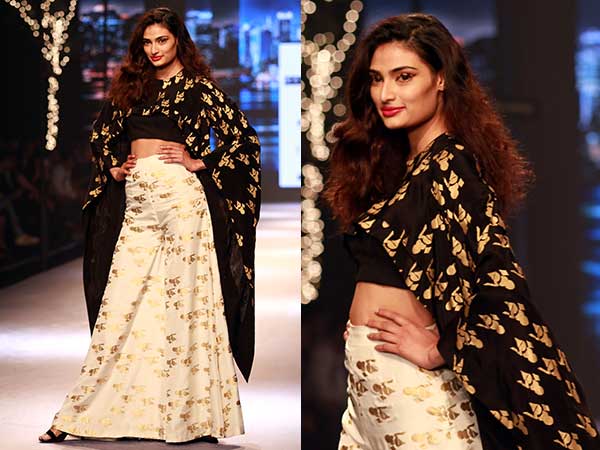 Athiya walked for Masaba in an exquisite pair of separates. The black top was enhanced with cape sleeves and was given a cutting edge look with the neat prints.