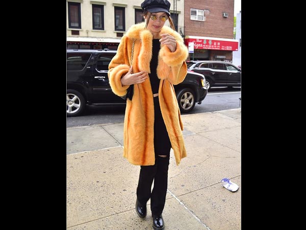 And once again, Bella was ready to give something colourful and worth covering to paparazzi. Bella flashed her svelte figure in a monochrome black ensemble as she stepped out. She paired a high neck black top with ripped black pants. Predominating gothic look was made to shine with the clever help of a bright fur orange coat.