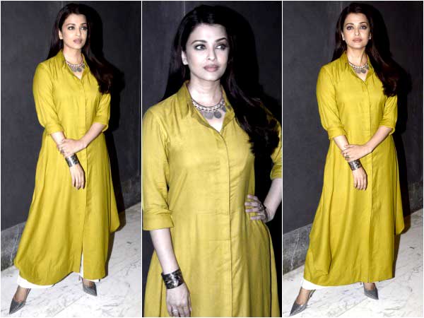 It seems green and shades of it are the colours of this week. Aishwarya opted for a maxi green tunic for the event. The quarter-sleeved collared and flared tunic graced Aish's silhouette. Aish paired this tunic with wide cotton pants and chunky jewellery. We loved her coin necklace, though. Chunky jewellery always goes well with cotton tunics. It rather defines the look well.