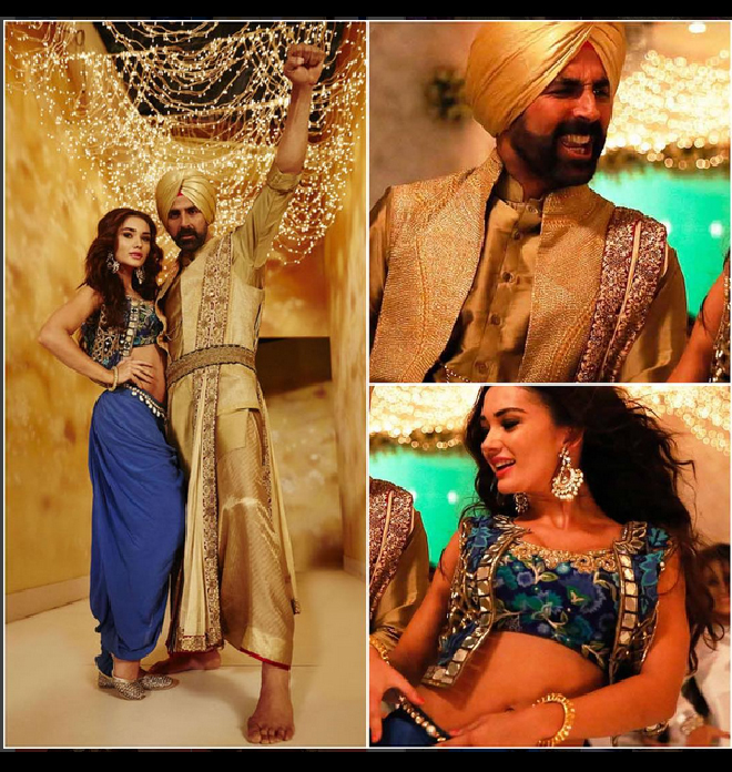 Akshay Kumar on the other side is dressed in a Tarun Tahiliani designed golden dhoti with a kurta and jacket.