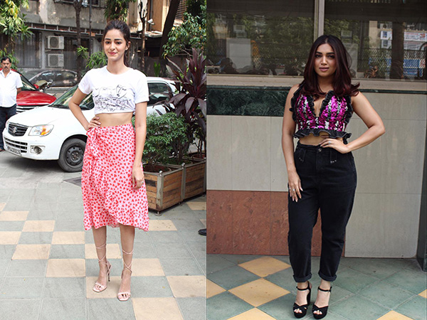 Pati Patni Aur Woh actress, Ananya Panday was spotted in the city in sassy separates. The actress wore a white-hued graphic crop top that was half-sleeved and paired it with heart motifs printed overlapping skirt. She looked sassy and we felt it was a fun party wear. The actress also teamed it with light pink sandals. She spruced up her look with pink lip shade and soft kohl. The impeccable bun rounded out her avatar.