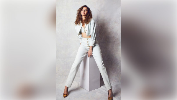 The actress slayed the monochromatic look with utter ease. She donned upon a denim while bralette, paired with high waist white pants and a cropped overall jacket. She completed the look with leopard printed heels and gold hoop earrings, along with her curled tresses left on loose.