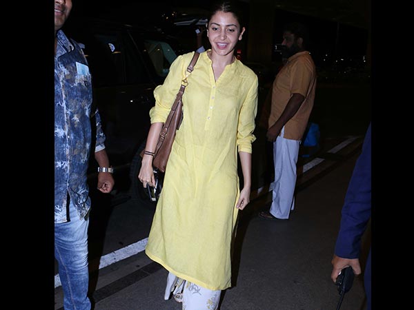She was recently spotted at the Mumbai airport wearing a plain cotton lemon-yellow suit and a pair of jootis. Anushka's oh-so-summery suit comprised of a long lemon-yellow kurti and one printed white cotton palazzo. The colour aptly complemented her complexion and gave her a bright look.