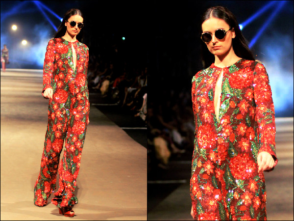 Sabyasachi Mukherjee showcased this golden sequin outfit, which had a Bohemian touch. This outfit is totally unique with the Western cut, including Indian art reflecting on it. As the model walked the ramp in this dress, we totally fell in love.
