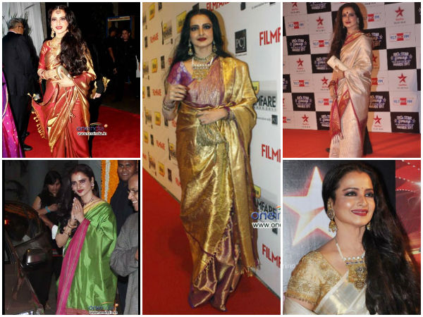 Rekha loves colour coordinating her saree look. She has always enjoyed the attention she gets when she walks onto a stage or on the green carpet. She exudes goddess-like beauty and glamour in her regal attire and we're sure there's more from where that came from.