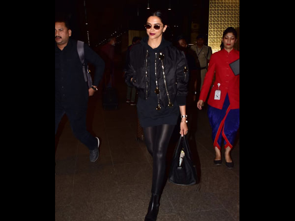 It was a chic black dress, which was structured and high-necked. This dress of Deepika's was stunning and made for an excellent evening party wear. She paired her black dress with sheer stockings, which went well with her outfit. The actress wore a short leather jacket and that notched up her airport avatar. She paired her ensemble with black boots and those boots were made for walking.