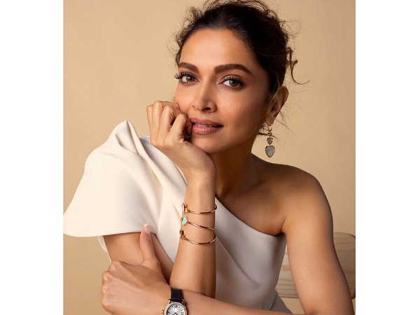 Deepika wore gorgeous earrings, which were crafted in rose gold, diamonds, and mother-of-pearl. Her bangles were also mainly made of rose gold but also had diamonds, white gold, mother-of-pearl, and turquoise stone. She also wore a black-strap watch that featured rose gold, stainless steel, and diamonds. All her jewellery and watch came from Chopard's Happy Women. The makeup was highlighted by glossy-pink lip shade, contoured cheekbones, and mascara with skin-toned eye shadow. The messy-style bun completed her look.