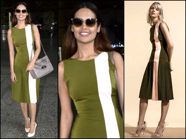 The Goa-based designer label Lola by Suman B's olive green outfit looked great on Esha, as she was spotted at the airport. The outfit is sleeveless with a round neck and has a body-con fit right upto the lower hip and then the magic of pleats starts. The accordion pleats sit gathered all the way below the knees.