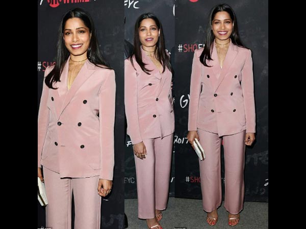 Freida Pinto turned heads in blush pink pantsuit and we think more people should switch to pantsuits for work lookbooks.