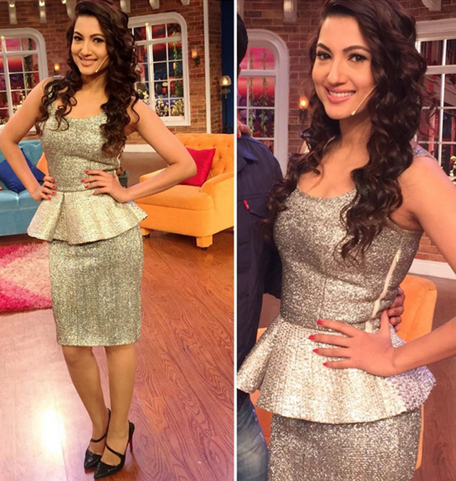 Gauahar picked up a Varul Bahl designed metallic peplum dress which had a pencil skirt for her appearance on the comedy TV show.