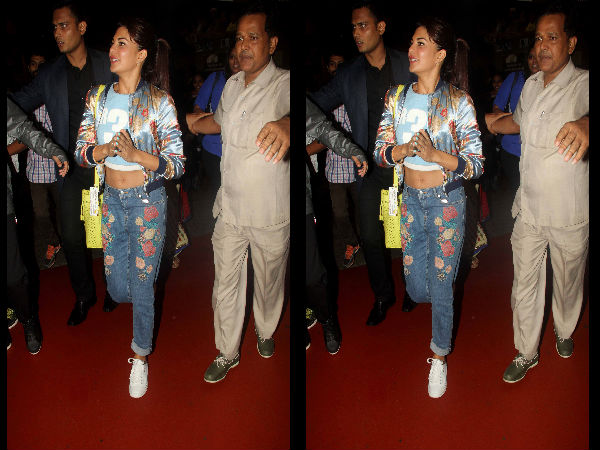 She was accompanied by her Dishoom co-stars John and Varun. Jacqueline's airport look comprised of a graphic bomber jacket. The silk printed jacket was paired with a light blue-coloured crop top and a boyfreind jeans.