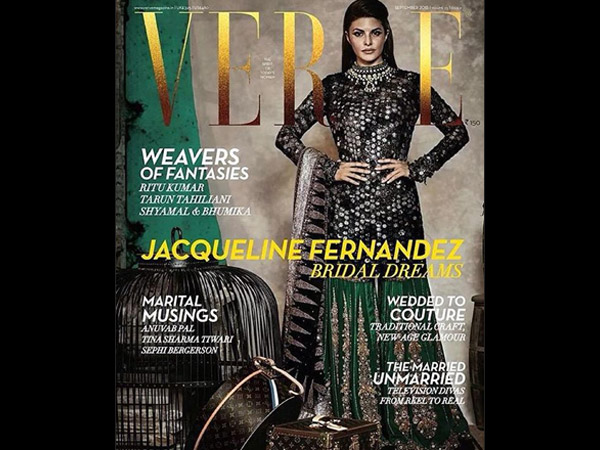 The stunning Sri-Lankan beauty is gracing the cover of Verve magazine's September issue 2015. Jacqueline is wearing a Sabyasachi Couture kurta with Anand Kabra sharara.