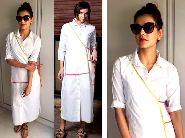 The dress is a combination of half wrap-up pattern and half placket front. Kajal paired this white comfy dress with a pair of tan stone-embellished sandals. Kajal looked like a pro diva with those Cat-eyed sunglasses and pink lipstick.