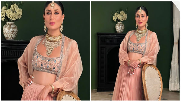 The gorgeous Kareena Kapoor Khan presented an ideal wedding outfit look by wearing a pastel peach lehenga from the shelves of designer Ridhi Mehra from her latest collection 'Roxann'. Speaking of her modern ethnic outfit details, the lehenga comprised an embroidered choli, an accordion-pleated lehenga skirt, and a flowy puff-sleeved cape jacket!