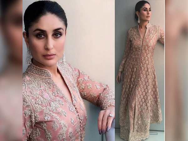 Kareena wore a sharara suit by Faraz Manan which made her look pretty gorgeous. The pastel peach traditional suit had shimmery motif embroidery all over its body and had a Chinese collar neckline.