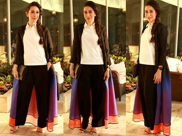 Karishma looked astounding in her black and white ensemble. She wore a crisp white shirt with an asymmetric button hem, paired with black wide-legged pants. The best part outfit was her maxi jacket by Urvashi Joneja.