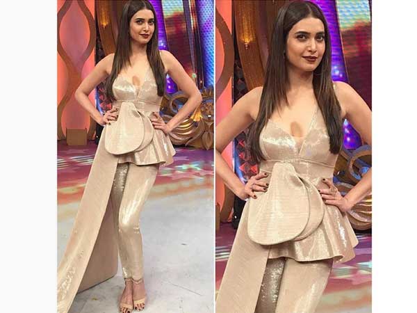 The attire she carried, had a tunic cut on the waist and a long piece of cloth on one side of the dress falling on the floor was one of the quirky additions to the outfit. The legging that was designed with the same fabric and colour was something that showed off her shape well.