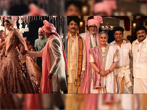 As for veteran actor, Amitabh Bachchan, his main wedding event outfit is highlighted by meticulously done cream sherwani and pink safa. His look is elevated by green gemstone neckpiece. In the second look, he has donned a white shirt and white and gold dhoti with a matching safa. The gold watch and sleek pendant chain accentuated his look. South India's celebrated actor, Nagarjuna is seen in cream and golden kurta and dhoti and vibrant stole. His look is upped with a classy pendant chain. So, what do you think about the ad shoot? Let us know that.