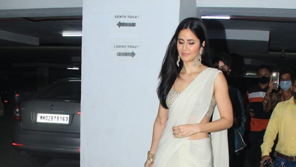 So, Katrina wore a white-toned ruffled saree that was designed by Arpita Mehta. It was a pristine white saree with layered and subtly-pleated ruffled accents. It was a lightweight saree and she teamed her ensemble with embellished blouse. It was a jewel-toned blouse that went well with her saree and she paired her saree with a pair of golden flats that complemented her saree. As for her jewellery, it was minimally done and the actress just wore heavy gold bangles, delicate ring, and intricately-done danglers to accentuate her look.