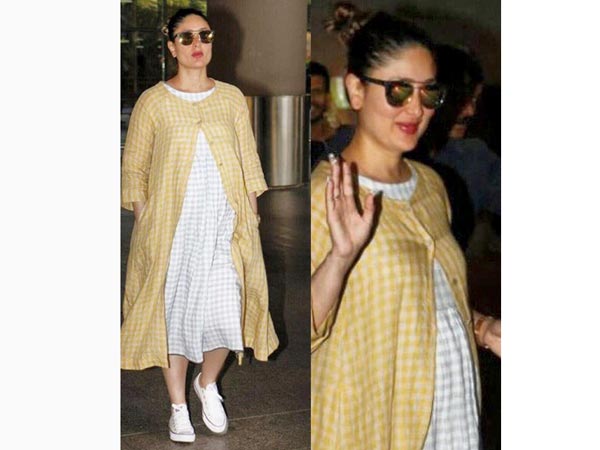 Mommy-to-be Kareena Kapoor (pleasantly) surprised us with yet another maternity outfit. The heavily pregnant actress was seen sporting an Eka gingham dress. She wore a blue dress paired with a mustard long jacket. The dress looked comfy and an apt choice.