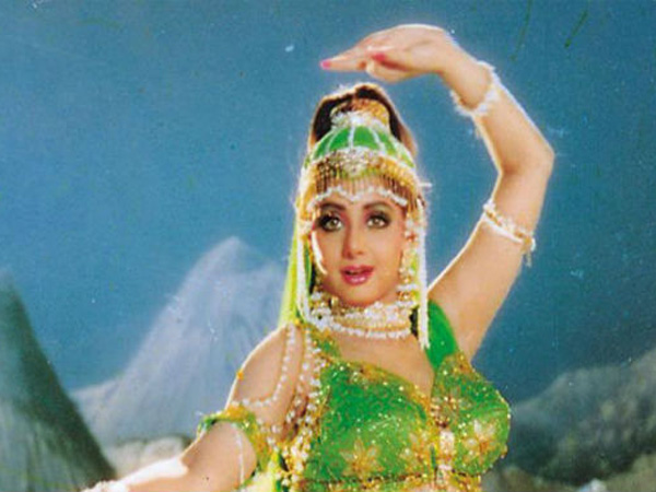 The poster of the film showed Sridevi dressed in green traditional attire. Her ensemble consisted of a sleeveless sweetheart-neckline blouse, which was accentuated by golden embroidered patterns. She paired it with matching flared bottoms while the light-green hued band-type belt added structure to her attire. Her jewellery game was very strong. She accessorised her look with a pair of white-pearl detailed gold-toned earrings, multi-layered choker, armlets, bracelets, and red nail paint. Sridevi pulled back her tresses into a hairdo. A white-pearl detailed green and gold-toned accessory covered her hair and forehead. Filled brows, kohled eyes, curled lashes, green eye shadow, and glossy pink lip shade rounded out her look.