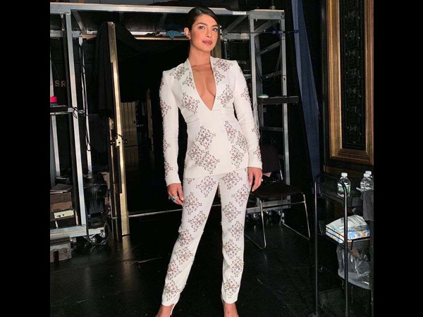 It was a structured outfit with crisp full sleeves and this attire was certainly accentuated by a deep neckline. This pantsuit of hers was not at all everybody's cup of tea but Priyanka pulled it off confidently and with a lot of grace. It was an ivory-hued pantsuit, which was detailed with meticulous embellished patterns. Tailored to perfection, Priyanka teamed her ensemble with pointed white pumps, which matched with her pantsuit.