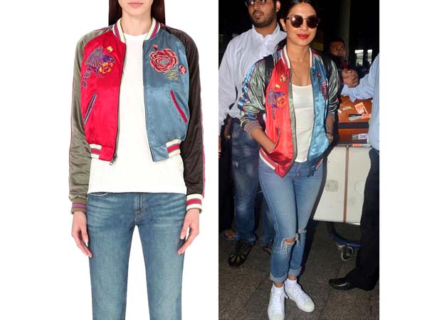 PC paired her jacket with her basic wardrobe; a white camisole and distressed denims. PC was also sporting white sneakers. It seems like Bollywood cannot seem to get over the sneaker craze.