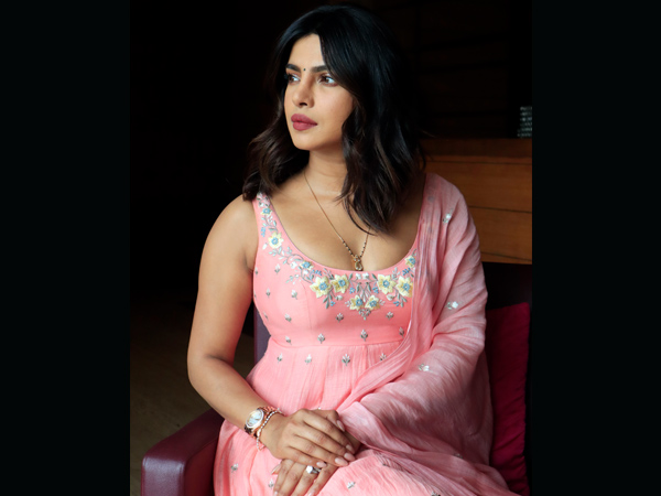 Going by the title of her film, Priyanka Chopra finally opted for a pink outfit that we have been waiting for from so long. Yesterday, the Krrish actress was spotted in a traditional pink-hued ensemble at the promotions in Ahmedabad and looked absolutely elegant. So, let's take a close look at her ethereal outfit and decode her beautiful look.