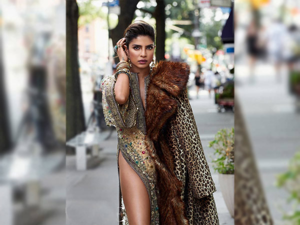 For the cover shot, Priyanka Chopra Jonas has not only played with colour-block trend but her outfit is also delightfully patterned. She teamed her sheer billowing-sleeved blouse with trousers. While, her blouse was accentuated by a shade of pink and dotted appliques, her pants were splashed in a shade of green and adorned with glittering floral accents. The jewellery-game was strong and her look was upped with tribal-inspired jewellery, which included elaborate bangles and statement precious stone rings. Well, on a closer look, we found that she also enhanced her look with a long chic necklace and an earring. The makeup was marked by highlighted cheekbones, magenta lip shade, nude-toned eye makeup. The messy and spiky bun rounded out Priyanka Chopra's look.