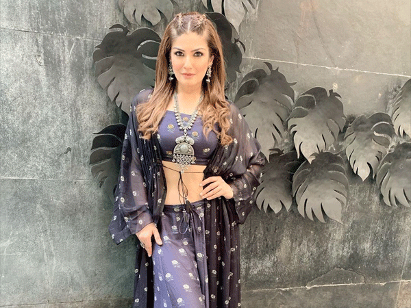So, Raveena wore a cyber-grape coloured ensemble by Paulmi and Harsh, which was enhanced by subtle embroidered accents. She paired her navy blue embroidered crop top with palazzos. Raveena Tandon also notched up her look with a pure organza jacket. Her attire came from the label's Sol Resort'19 collection.